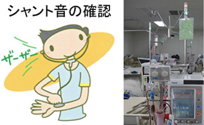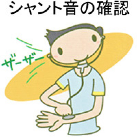 患者様御本人にも、手で触れることや聴診器などを用いて音を確認するなど常日頃からシャントを気にしていただくようにすることで、より良いシャント維持をすることができます。