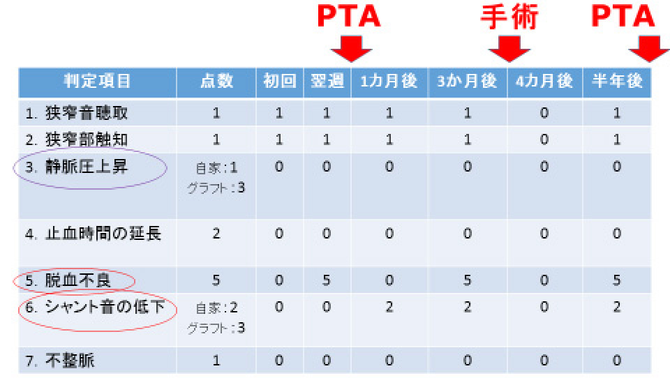 具体的には、1~3ヶ月毎にスタッフによるシャントチェック(シャントスコアリングシートの活用)⇒医師による診察⇒必要に応じて超音波検査⇒造影検査⇒治療(バルーン拡張術(PTA)や手術)という体制を作っております。